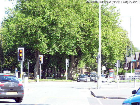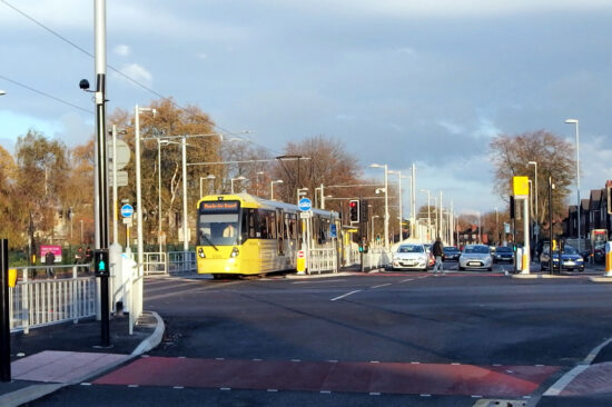 Things had changed significantly by 18th November 2014 (just 15 days after trams started running) with 3068 seen departing what is now Barlow Moor Road tramstop on the way to Manchester Airport. Whereas before it was cars everywhere, now they have to wait as the tram gets right of way on its dedicated section. (Both Photographs by Keith Chadbourne)