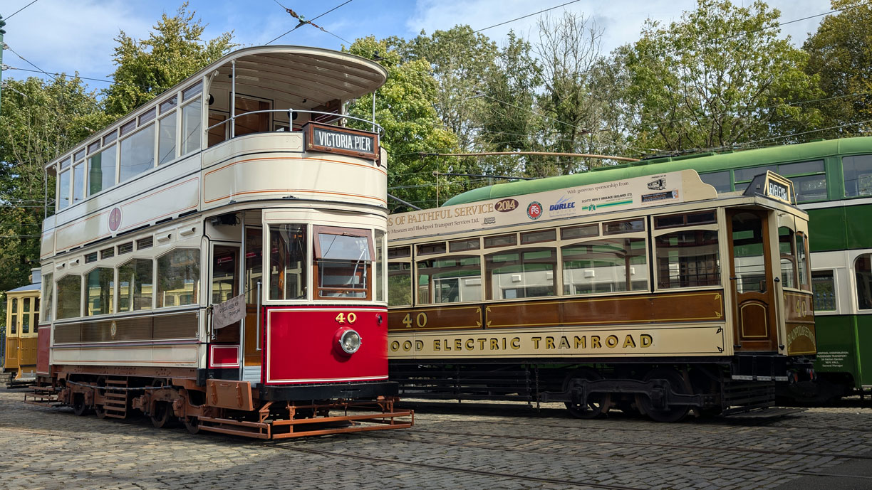 Two Blackpool no. 40s lined-up on the depot fan. Standard 40 on the left and Box Car 40 on the right.