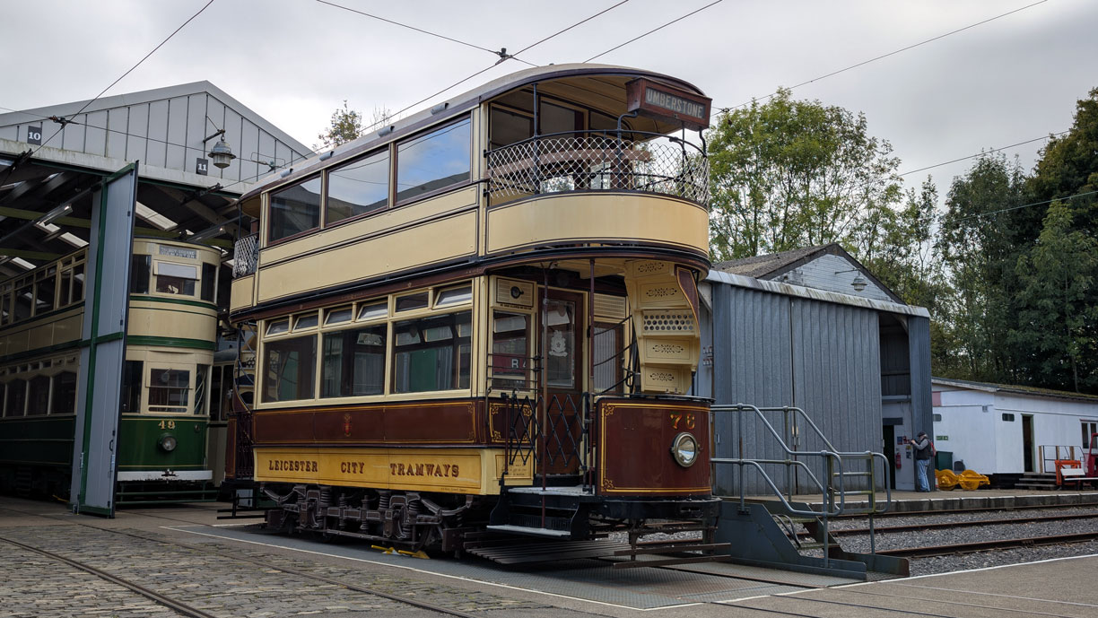 Three long stored trams were also pulled out of the depots and Exhibition Hall at different times for display. The morning saw Johannesburg 60 displayed on the Traverser before the afternoon saw Sheffield 189 come out (as the tram that “found” Crich) and then towards the end of the day Leicester 76 was moved out of the Exhibition Hall after a request from a visitor. The move of 189 also required Blackpool 49 to make a very brief appearance as it is stabled in front of it in the depots.