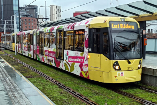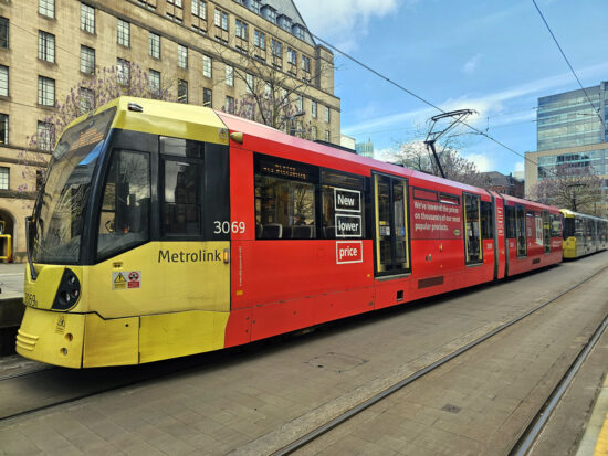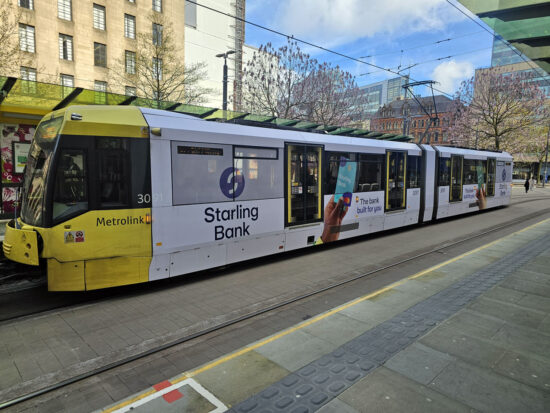 3091 was one of two trams to receive identical ads for Starling Bank in March 2024 – the second time they had two adverts at the same time. We capture the tram here at St Peter’s Square when it’s the lead tram in a double unit.