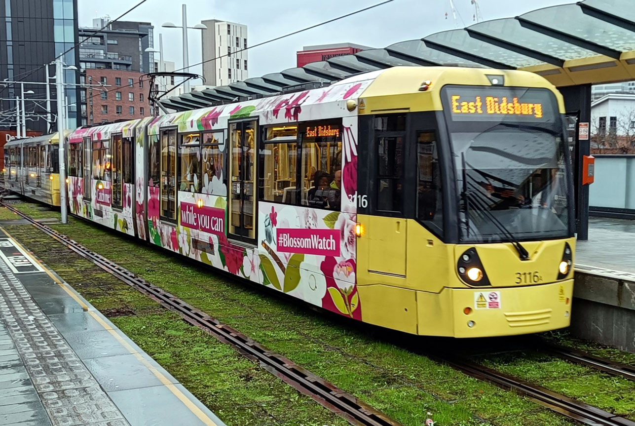 And 3116 started to advertise the National Trust in March 2024 as part of their Blossom Watch campaign (West Midlands Metro 44 also received a similar ad just before this one was unveiled). At Deansgate Castlefield its at the head of a double which is off to East Didsbury. (All Photographs by Michael Morton, 17th April 2024)