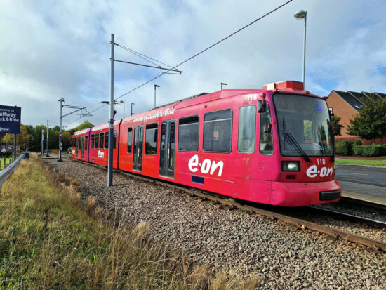 One of two recent new adverts to be seen on the South Yorkshire Supertram system is this design for e-on being carried on 118. Replacing a long-standing ad for Pretty Little Thing, the tram was unveiled in October 2024 in the dark red advert. Supertram is the second tramway in England to have an advert for e-on with the company have a long association with Nottingham Express Transit. 118 is at Halfway. (Photograph by Ryan Hartley)