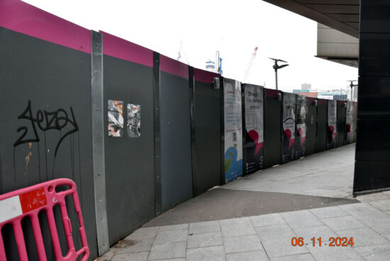 Here we approach the Clayton Hotel and you can see Midland Metro Alliance work underway between the footpath and HS2 site.
