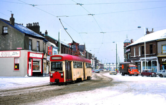 We’re in the centre of Fleetwood for this photo and not many motor vehicles have yet disturbed the snow as OMO 3 negotiates the curves of Albert Square on its way to Fleetwood Ferry. The shop outside which the W.H. Smith lorry is parked was the company’s Fleetwood wholesale premises. Although that has long gone, there is now a W.H. Smith Local retail shop, also housing a post office, at the other end of Lord Street close to the Fisherman’s Walk stop. In 1979 the Cowens Butchers sign on the Adelaide Street side of the shop looked new. Amazingly this was still in situ until very recently, though much the worse for wear and without a butcher to advertise. Despite the shop-front adverts for Agfa, this photo was taken on Kodachrome.