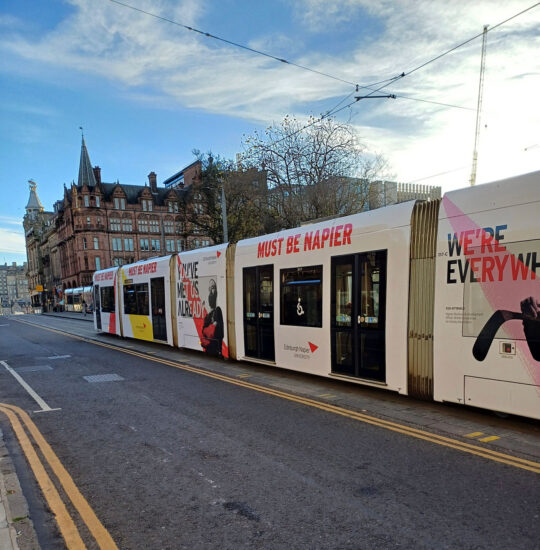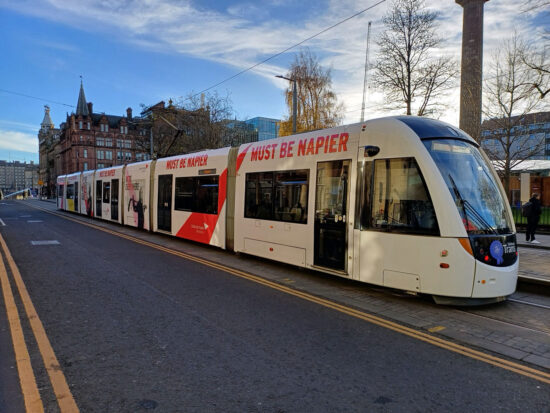 Although at first glance you may not realise it as much of the base colour is white but this is a full wrap advert for Edinburgh Napier University which is carried on 257. This ad has been in place since September 2024 and is the first time that this particular tram has had a full wrap and the second time its advertised the University. Its off to the Airport in this afternoon view.
