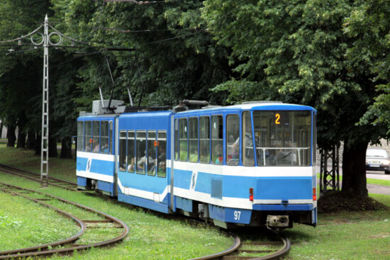 Featured in the below image is another Tatra product. 97 was built in 1985 for Tallin and was originally designated as a KT4SU. It would then undergo modernisation in 2004 when it became a KT6T which is the condition we see the tram in here. The tram is heading away from us with a service on route 2 which the single ended tram in the blue and white fleet livery.