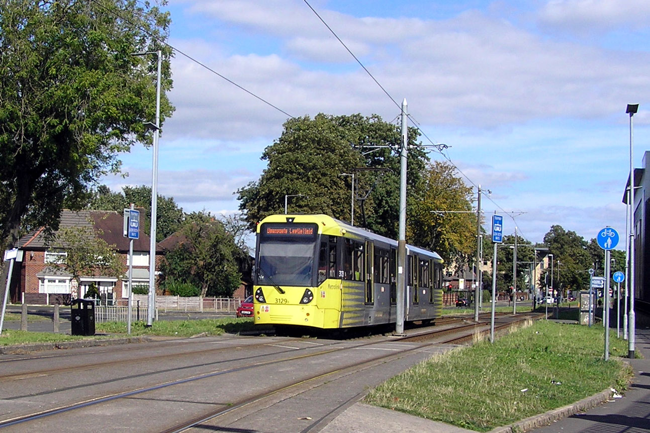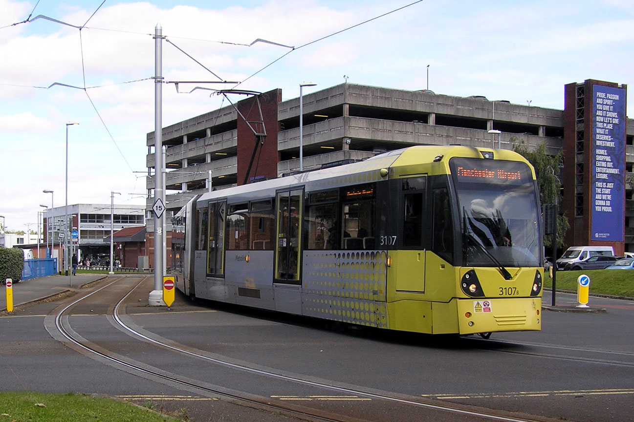 In this first photo we see 3107 having just left Wythenshawe Town Centre as it makes its way to Manchester Airport. The tramstop of the same name is hidden being just around the corner as the line comes from the left.