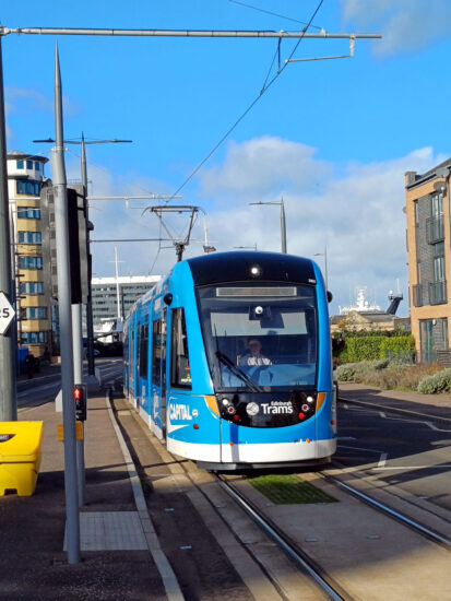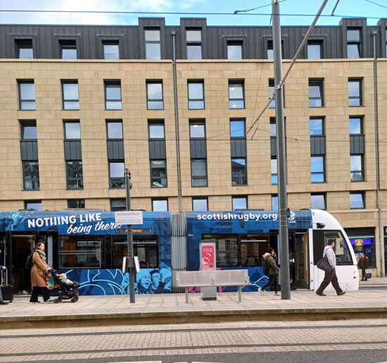 Scottish Rugby have been a long-time advertiser on Edinburgh Trams and this particular advert was applied in September 2024. A bit of a rarity in that it wasn’t a direct replacement for another advert as 260 had been out of service for several months with accident damage and had been seen around the depot with no adverts at all. Bound for Newhaven, the tram is at McDonald Road with PBSA (purpose built student accommodation) behind. (Photograph by Roy Calderwood, 24th October 2024)