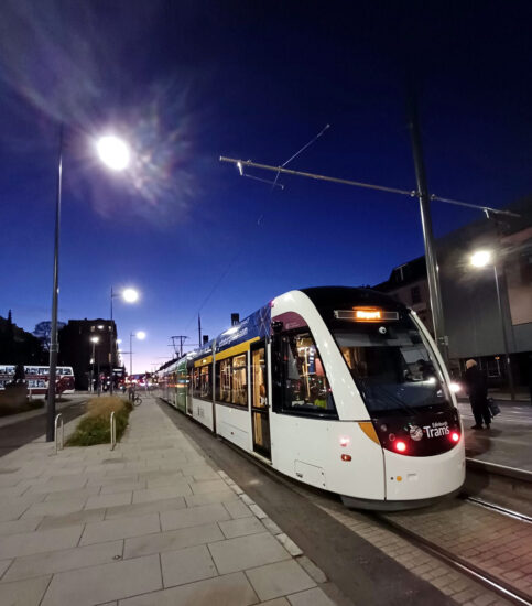 With it being almost the end of October this photo may be in the dark but its only around 1715 as we look west at Picardy Place. We look at the rear of 261 in this image which is making its way from Newhaven to Edinburgh Airport. (Photograph by Roy Calderwood, 29th October 2024)