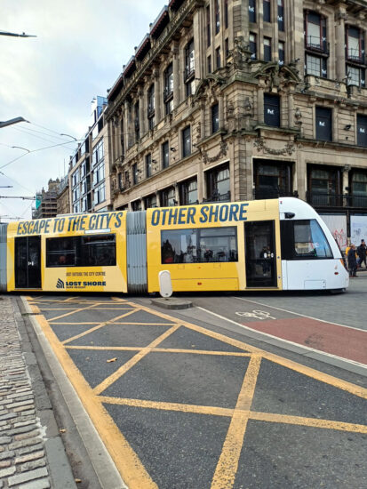 Here we see the rear of 268 as it turns onto Princes Street from South Saint Andrew Street on its way to the Airport. Its carrying an advert for Lost Shore, which is a new surf resort in the west of the city. Using the messaging “Escape to the City’s Other Shore”, it reminds us that Shore in Edinburgh is now referred to the riverside street in Leith called Shore – where ships tied up on the Water of Leith before the first enclosed docks were built. Behind the tram we see the former Edwardian department store R W Forsyth. Opened in c1907 it closed in the mid 1980s and latterly became a Topman/Topshop and a Travelodge. The former went bust and Travelodge has now also closed but there are plans to revive the building with retail and hotel use. (Photograph by Roy Calderwood, 31st October 2024)