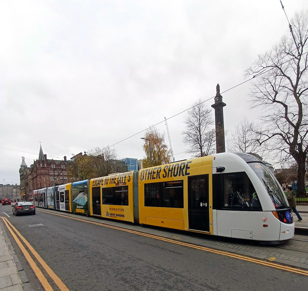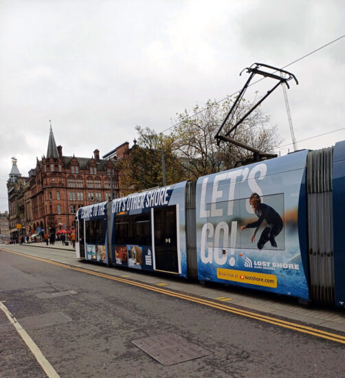 As with other advertising liveries in Edinburgh, this design features full height ads on two of the sections of the tram. This photo shows one of them for the Lost Shore advert encouraging you to “Let’s Go” and surf at the resort. (Photographs x2 by Roy Calderwood, 2nd November 2024)