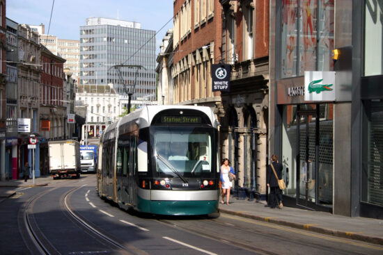 That tram is one of the original fleet of Bombardier Incentro trams, 212. We first see the tram on 4th June 2009 climbing away from Old Market Square on the way to Lace Market and then Station Street. The tram retains the original NET fleet livery and on the part of the tram we see here at least is also devoid of any external advertising.