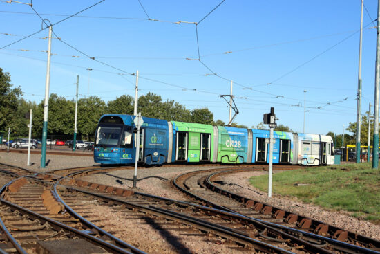 Then on 16th September 2024 we see the tram again, although it is now carrying a full wrap for the Nottingham Carbon Neutral 2028 campaign. These vinyls have now been in place since November 2021. The tram is just disappearing into Wilkinson Street Depot with it apparently suffering from a fault as it should have been continuing to Hucknall. (Both Photographs by Gareth Prior)