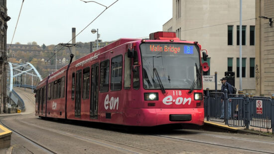 October 2024 saw 118 receive a new advertising contract with e-on taking out their first wrap in Sheffield. In a slightly different style to the e-on adverts in Nottingham there is still no doubt what the tram is advertising with the e-on logo plastered all over it! The tram is at Fitzalan Square/Ponds Forge on 5th November 2024 in this photo. (Photograph by Steven Hughes)