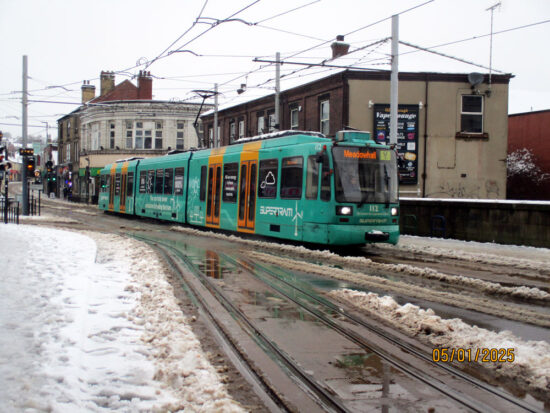 The first third of January 2025 has been rather dominated by the weather with plenty of the white stuff having fallen affecting various tramways. One of the locations to be so impacted has been the South Yorkshire Supertram system and that is where this photo was taken on 5th January 2025. It shows 112 – in the Supertram is green livery – at Hillsborough as its working a Yellow route service bound for Meadowhall. The snow on the road has already started to turn to slush. (Photograph by Stuart Cooke)