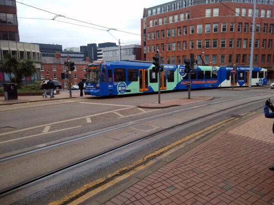 The short-term JD Sports vinyls which had been seen in both Manchester and Sheffield are now no more with those carried on Supertram’s 115 removed and replaced by a new set promoting Park and Ride sites at stops across the network. Metrolink’s 3118 had lost its vinyls during January.