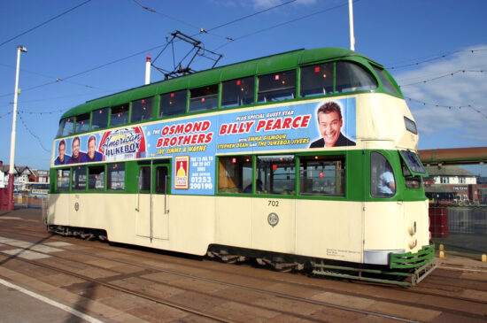 The old traditional tramway is where we start and this image was taken on 6th September 2005. Balloon 702 calls at the stop (with its long shelter) with a service which is only going to Manchester Square which suggests this may have been a special with it heading back to depot after its time was over. The tram is in a heritage green and cream livery style but does also have “T” adverts for the summer show at the Grand Theatre – “Jimmy Osmond’s American Jukebox Show”. This featured three of the Osmond Brothers (Jay, Jimmy and Wayne) with support from Billy Pearce and ran throughout the main summer and illumination seasons, a far cry from today where there are more one nighters in the theatres of the town. 702 is now resident at the Heaton Park Tramway in Manchester, albeit not operational.