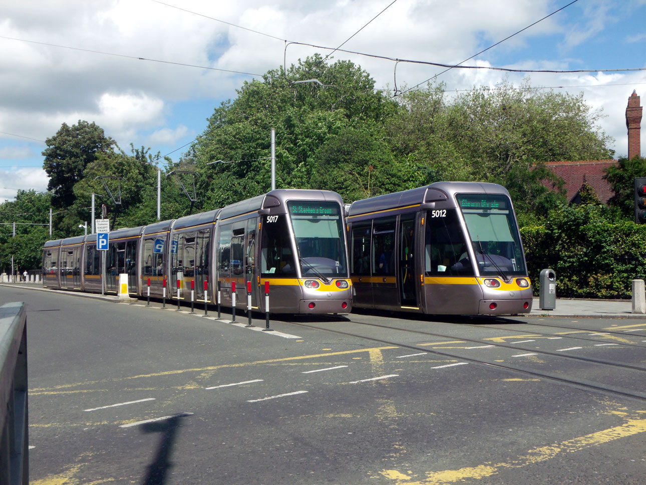 The trams are numbered 5017 and 5012 and they are working Green line services. The higher numbered tram is bound for St Stephen’s Green (which was the terminus before the line was extended out to Broombridge) whilst 5012 is working the other way to Brides Glen (Gleann Bhride in Irish Gaelic as seen on the display here).