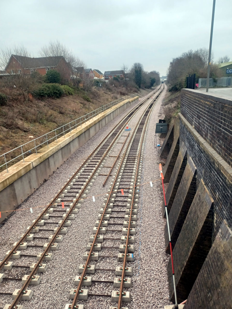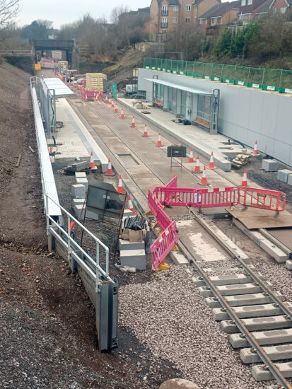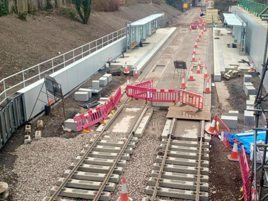 Another look down to Horseley Road stop. More edging stones for the platforms (already complete with yellow warning line!) wait for installation on the right. Also seen here is the change from the track being enclosed by concrete through the stop and the standard reserved track either side. (All Photographs by Chris Allsop-Buckler, 16th February 2025)