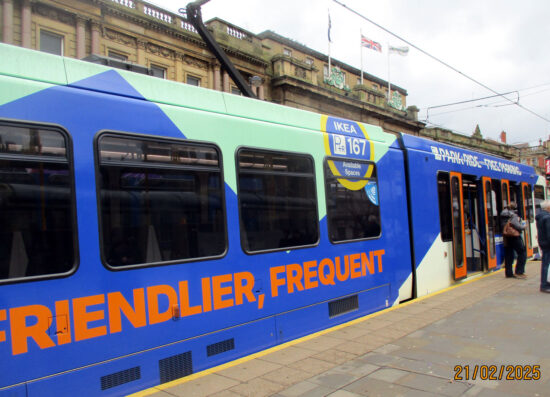And back to the other side of the tram with the difference in design seen. The same slogan is used and more of the available park and ride sites are given. Further done the tram comes the important message that parking is free at all these sites. (All Photographs by Stuart Cooke, 21st February 2025)