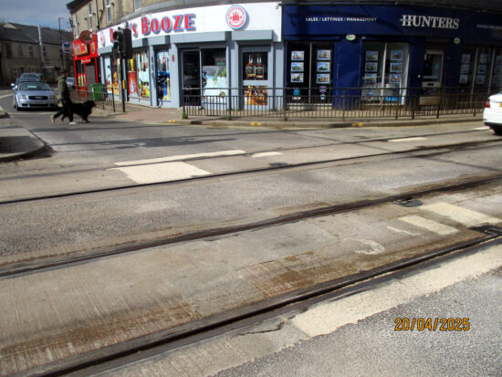 The condition of the trackbed at Hillsborough Corner – the junction where the Blue route heads along Holme Lane and the Yellow route continues along Middlewood Road – has been starting to cause some concern and so one of the major pieces of work over these three days was to work on that. This image shows some of the repairs on Middlewood Road.