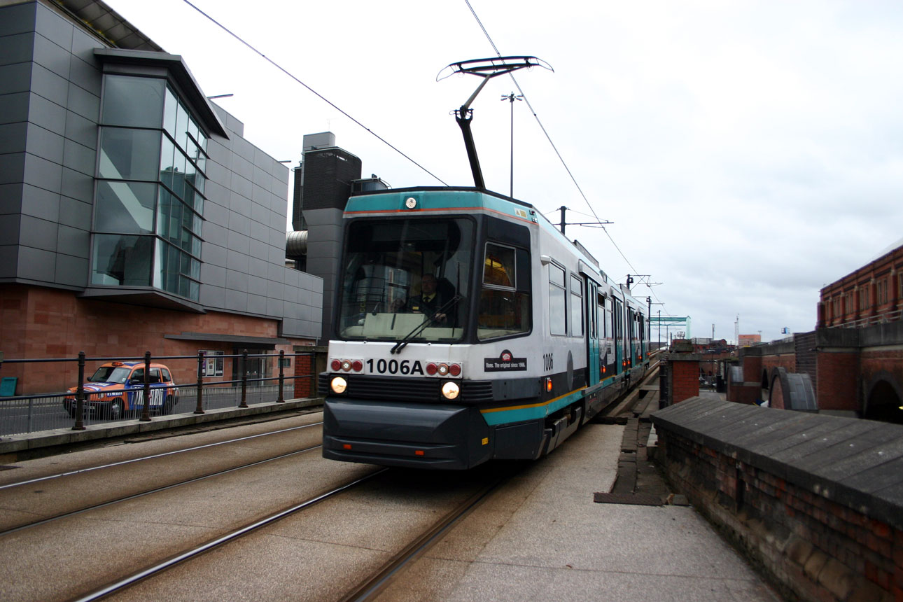 The older image is again of a T68 and this photo was taken on 8th April 2012. It depicts 1006 which is just descending from the ramp leading to the viaduct which takes the trams out of the city (G-Mex/Deansgate-Castlefield next stop). Manchester Central convention centre (still G-Mex then) on the right and the Bridgewater Hall on the other side of the road on the left. 1006 is the tram which approaches us, this tram would be withdrawn on 30th August 2012 and left for scrapping 13th June 2014.