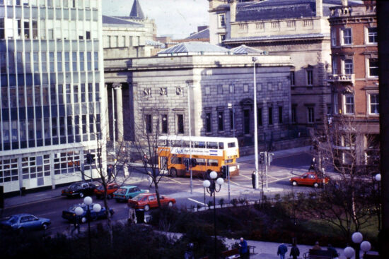 Its 1989 and Metrolink construction is not yet underway and presumably its winter as the trees have no leaves on them. The familiarly coloured orange Greater Manchester bus is just heading along Mosley Street and is crossing over the junction with Princess Street. Whilst a lot of the buildings and surroundings have changed we do at least have Manchester Art Gallery immediately above the bus which helps us to work out just where we are.