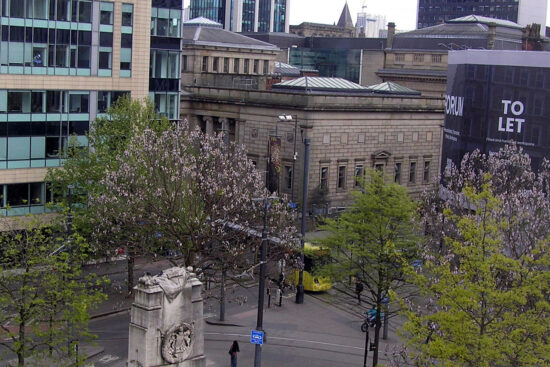 Onto 25th April 2025 and there are still lots of trees but spring has sprung which almost blocks our view of a tram in almost the same position as the bus in the previous image. Manchester Art Gallery can still be seen but other buildings have changed. In the foreground we see 2CC heading off to the left with the tram being on 1CC along Mosley Street. (Both Photographs by Keith Chadbourne)