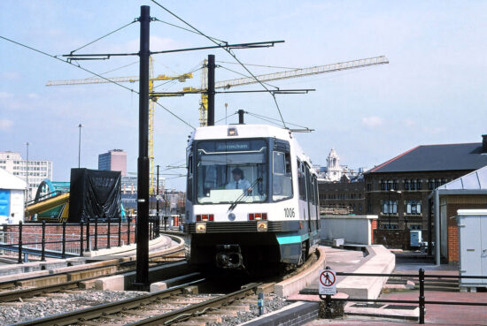 1006 curves into the G-MEX stop, with a service for Altrincham. In the background cranes are at work modifying the landscape of Lower Mosley Street – and cranes have become a familiar sight towering over the city ever since as Manchester’s tower blocks rise ever higher.
