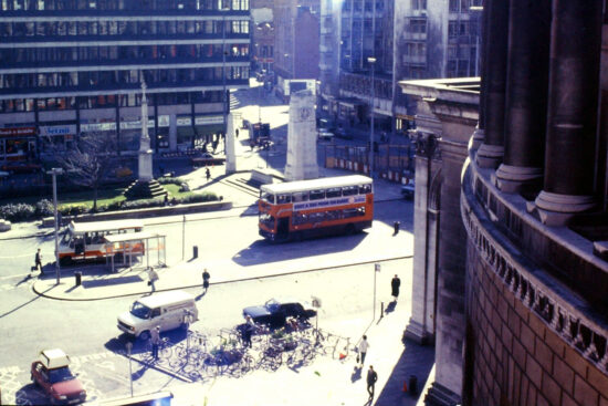 Again the “Then” comes from 1989 and looks down at a different St Peter’s Square when the only form of public transport was rubber tyred buses and not steel wheeled trams. The minibus at the front is a Little Gem whilst the bigger bus is a normal Greater Manchester PTE liveried bus with its between deck advert letting you know you can rent a bus from them.