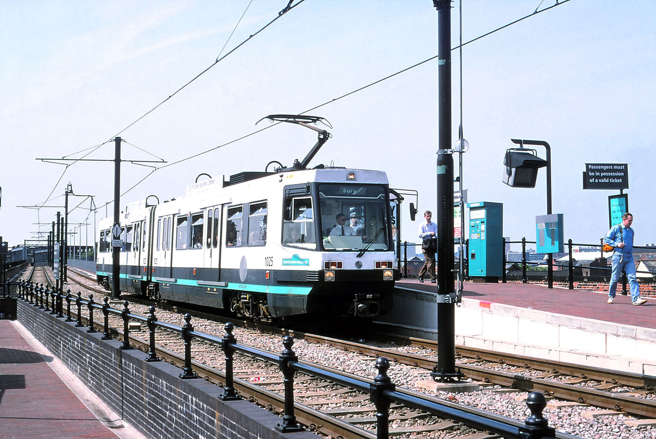 1025 ‘Christie Metro Challenger’ pauses at G-MEX with an inbound service heading for Bury. The turquoise image of the time is very apparent and the bare two platform station is unrecognisable when compared with today’s three platform Deansgate-Castlefield stop (the renaming took place in 2010) with its yellow look and extensive platform canopies.