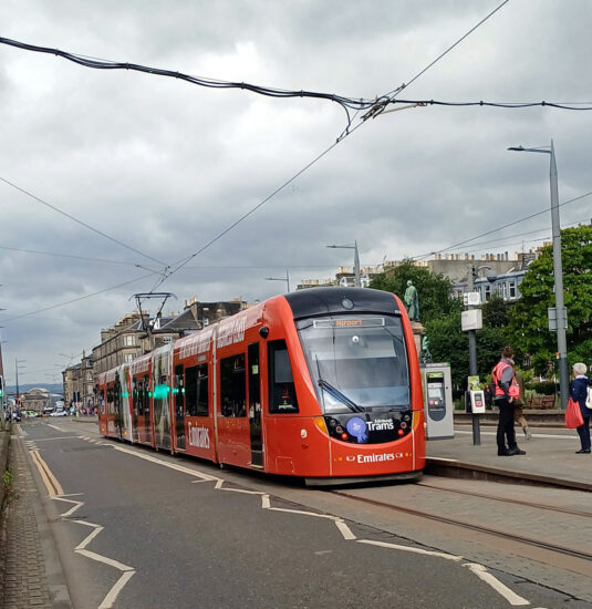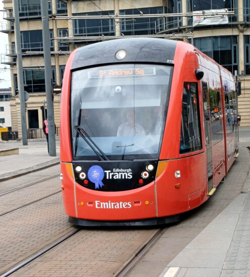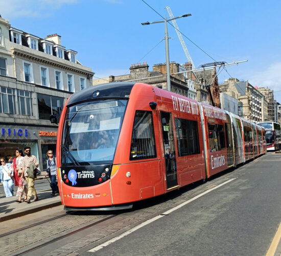 272 in its Emirates advert as it calls at West End with a service heading to the Airport. A roving Edinburgh Trams staff member is on the platform to help would-be passengers.