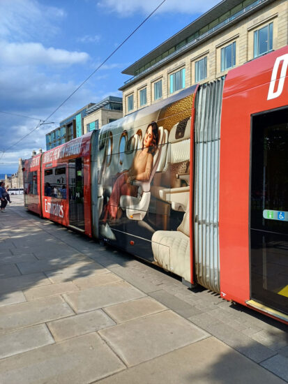 Another of the trams to have received the advert is 258 – which had previously been advertising the Rio Brazilian Steakhouse. Whereas earlier we saw trams in the sun the weather has now deteriorated somewhat in this view at Haymarket.