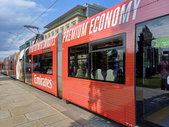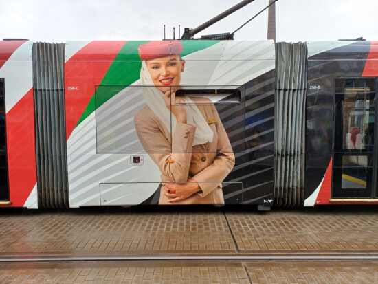 As we reported at the end of May, a number of trams in Edinburgh have received new full wrap adverts for Emirates. At the time of writing six trams – 255, 257, 258, 268, 272 and 273 – have received identical wraps and its expected that more will be on the way with a new tram currently being wrapped on most days. In this article we take a closer look at the new advert on some of the trams.