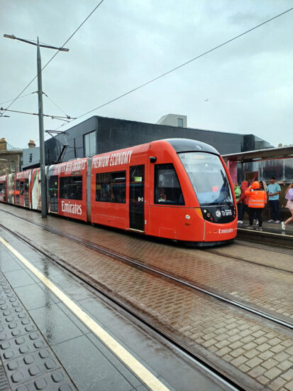 A fourth of the Emirates trams is seen in this photo as it arrives at Haymarket with a short working to St Andrew Square. With Robbie Williams performing at Murrayfield Stadium extra trams were out with some of them turning short at St Andrew Square and then running onto York Place to use the crossover there before returning towards the Airport – and probably more importantly for most people travelling Murrayfield. (All Photographs by Roy Calderwood, 31st May 2025)