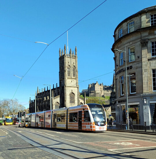 The tram we feature in this photo has had a change of image since this was captured as it is now one of the many which have received full wraps for Emirates. But at the time of this shot it was still advertising Uniqlo (this was in fact its third consecutive ad for the clothing retailer) and is seen leaving Princes Street at the West End and proceeding on to Shandwick Place. In the centre of the picture is St John’s Episcopal Church, with the castle also visible to the right. Then just to the right of the castle is another spire which is of St Cuthbert’s Kirk, another historic church (and where Agatha Christie’s second marriage took place). (Photograph by Roy Calderwood, 20th April 2025)