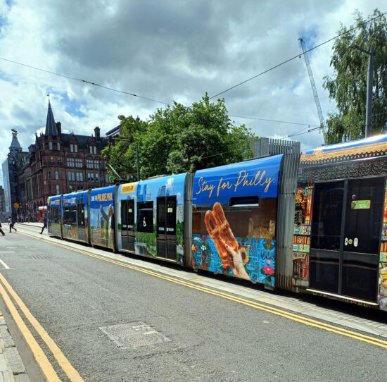 There seems to be a bit of a theme with recent adverts on Edinburgh Trams – they seem to be encouraging people to leave Edinburgh behind and go somewhere far, far away! And that has continued with the latest new advert as 275 is now advertising Philadelphia, USA with the tram carrying its first full wrap.