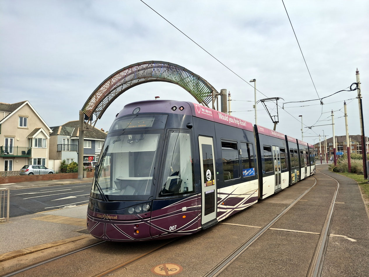 007 is one of only two of the Flexity2 trams to be named with it carrying the name of Alan Whitbread, a former member of staff at Blackpool Transport who passed away in 2015. Despite its naming some 10 years ago, it did subsequently received external advertising with it having carried above window adverts for Organ Donation for the past few years. Like many of its sisters it also received adverts for heart attack prevention on the centre section below the windows a couple of years ago.