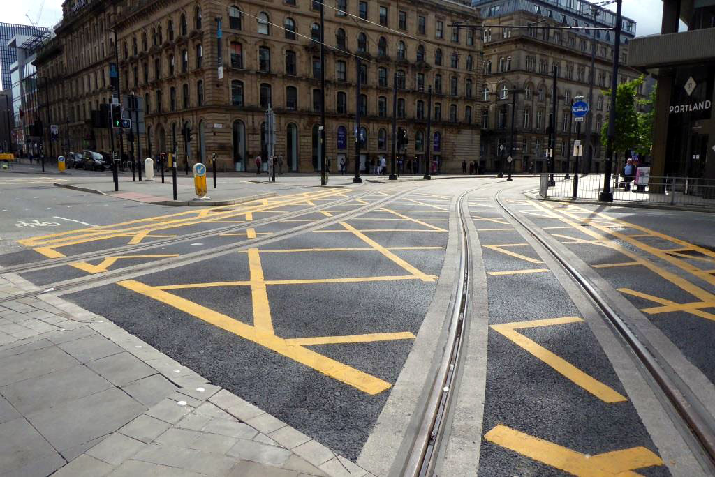 Here we can see the completed renewal of the curves across Portland Street which were replaced during an earlier stage of the work. A section of the track on Aytoun Street was renewed at the same time.