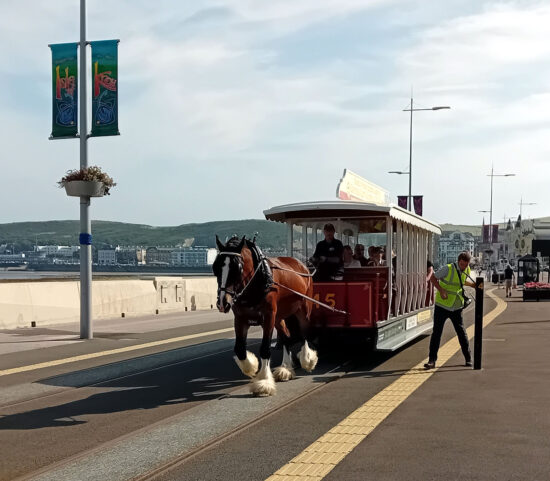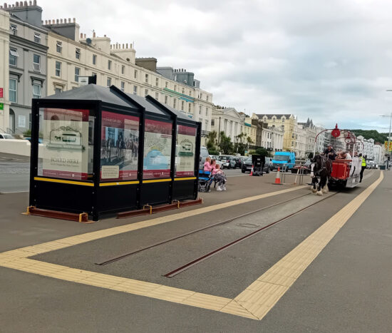 The temporary terminus has now received a shelter with plenty of signage to let people know exactly where to catch the horse trams from. Here we see 21 arriving on 25th July 2025 hauled by Nelson to form the 1700 departure to Derby Castle.