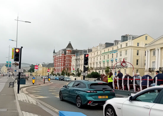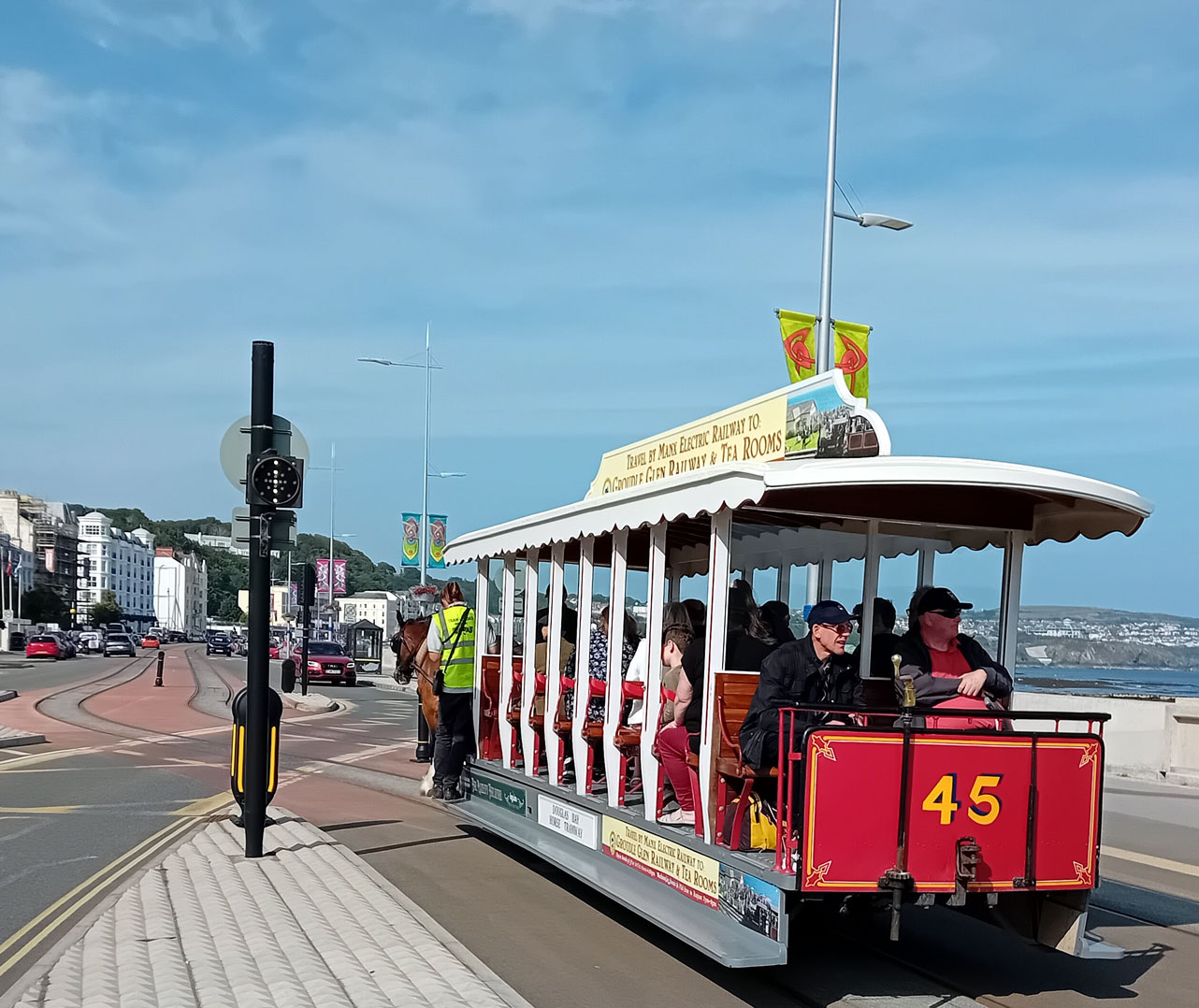 The only operational tramway lights on the route are on the approach to the terminus and in this view we see the first tram of the day, the 0900 ex Derby Castle, tripping the electronics to hold the traffic and get clearance to proceed to the terminus. 21 is the tram with Torrin providing horse power and its 25th July 2025.