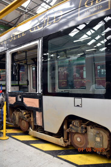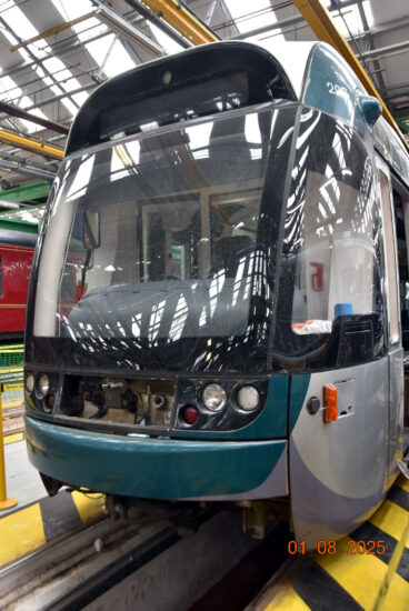 But 398 019 wasn’t the only tram related vehicle which could be seen as tucked away in one of the workshops at Litchurch Lane was Nottingham Express Transit Incentro 207. This tram suffered accident damage in February 2025 at Royal Centre in Nottingham City Centre and has been moved to Derby for repairs, the move taking place in June 2025. It’s the second NET tram to have headed this way in the past year, following on from 232 which also received accident repairs.