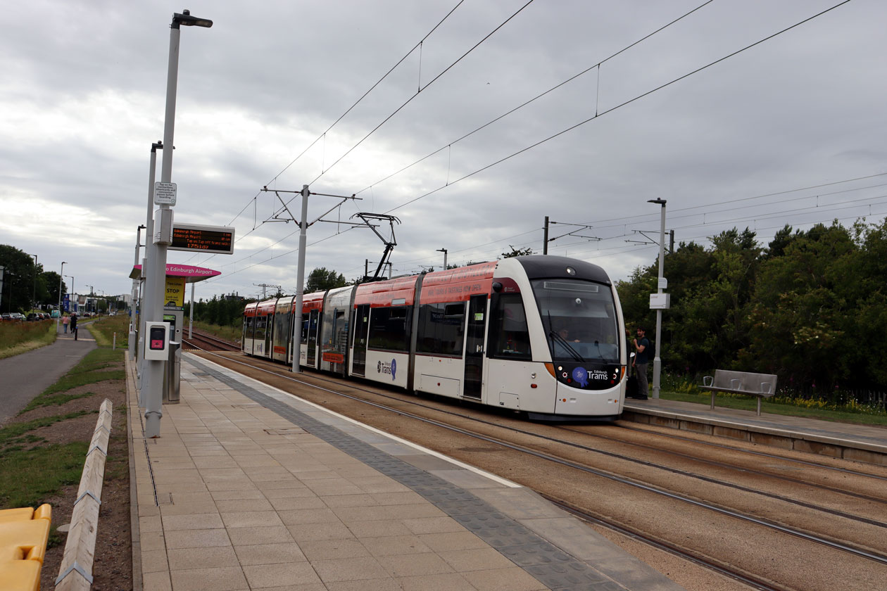 We then see 274 – advert for Royal Yacht Britannia – arriving as it goes in the opposite direction to the Airport. In the distance we see how the tramway comes down from a slope as it arrives at the stop. At the time of these photos Bankhead was the last stop on the network to have extensive signage for the LRSSB led safety campaign “TWO LINES = STOP” as seen with the bright yellow on shelters on both platforms. (Both Photographs by Gareth Prior, 29th June 2025)