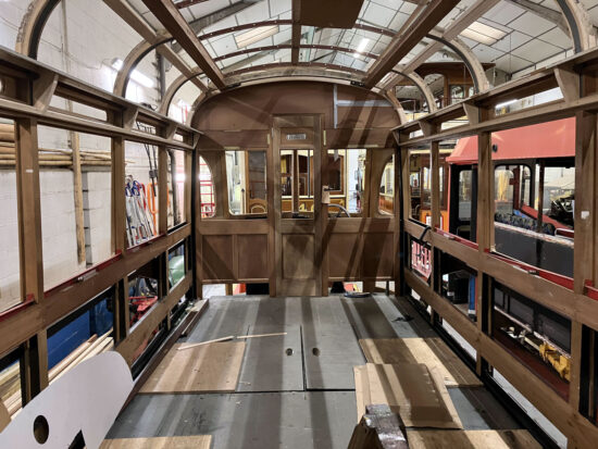 Work has continued on fitting the internal wood panelling and the external drivers cab end doors. All the parts for the bogies, including axles, wheelsets, motors, springs and ancillary parts have arrived at Crich from a specialist contractor. Reassembly of these into the bogie frames is to begin in the near future. As work progressed on the bogie parts a number of missing and defective components were identified, along with some new requirements. This caused delays and additional costs. All of these issues have now been overcome, by the resourceful efforts of the Crich workshop team and the contractors.