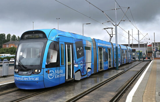 The sun doesn’t always shine in July as this photo taken at Nottingham Express Transit’s Hucknall terminus shows. Bombardier Incentro tram no. 211 ‘Robin Hood’ is captured in blue Mark’s Electricals advertisement livery as it stands beneath a threatening sky on Thursday 17 July 2025 with the 1440 service to Toton Lane. This advert has been on the tram since January 2024, its sixth different ad which makes it the tram in Nottingham to have carried the most adverts since the system opened in 2004. (Photograph by John Binch, 17th July 2025)