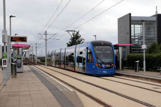 Edinburgh Park railway station is on the right of this shot (with the stairs leading to the overbridge across the double-track railway line just visible through the windows) as we see 275 arriving at Edinburgh Park Station tramstop. At this time the tram had a short-lived wrap for Philadelphia (only lasting around a month) as it arrives with a Airport-Newhaven service. The viaduct taking the tram into Edinburgh Park is seen behind. 27th June 2025.
