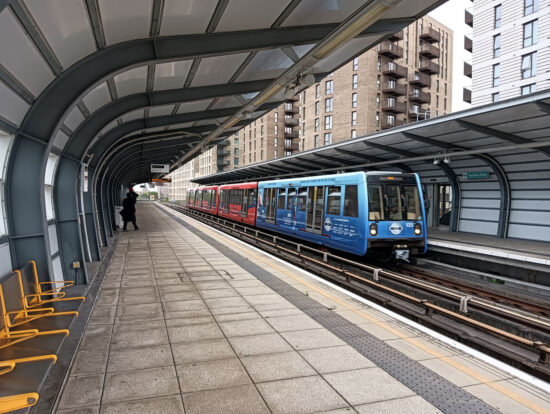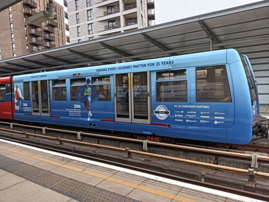 We saw a few weeks ago that as part of Transport for London’s 25th anniversary celebrations a half warp had been added to London Trams CR4000 2537. London Trams aren’t the only transport network in the city which has joined in the celebrations either with the DLR also outshopping one of their trains in the special livery.