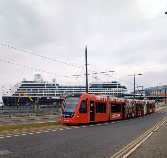 “Trams &” goes to Edinburgh as we see one of the trams running on the Newhaven extension along with a visiting cruise ship.