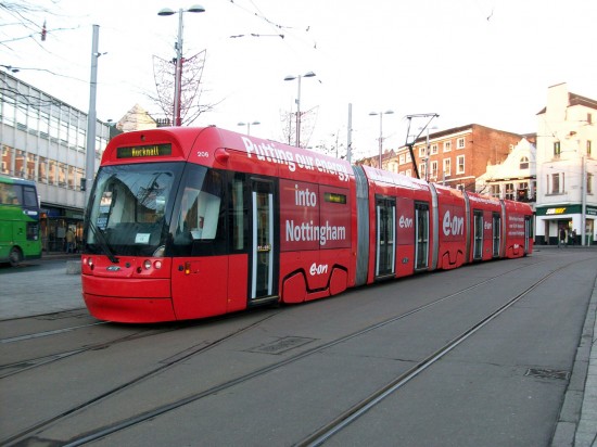 As predicted at the weekend Nottingham Express Transit Incentro 206 has now received a full vinyl wrap livery for e-on, replacing 208 which is expected to shortly enter the workshops for a full refurbishment. 206’s advert is almost identical to that formerly carried by 208 and includes contravision over the windows. 208 currently remains in service with most of the e-on vinyls removed.