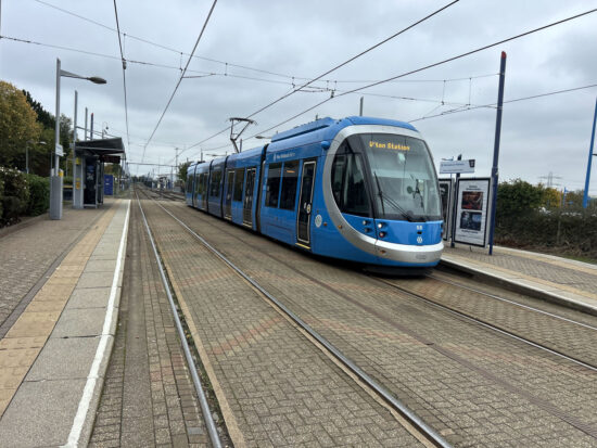 58 is seen here at Wednesbury Parkway with the full blue fleet livery shown once again for the first time in just over a year. The tram is working to Wolverhampton Station. At this time alternate departures were working through to Wolverhampton St George’s. (Photograph by Shiv Patel, 11th October 2025)